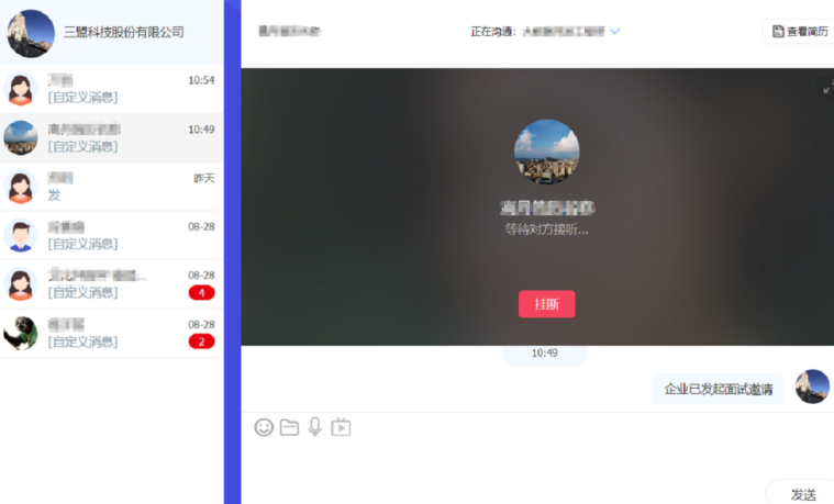 企业可以在简历管理中,对简历进行筛选,选择合适的人才进入到笔面试页面,邀请学生进行视频面试,到双方约定的面试时间进行视频面试。