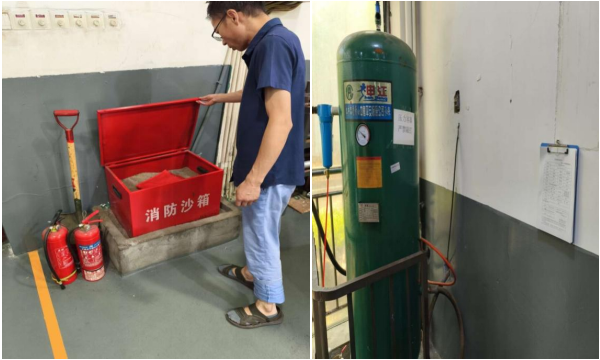 工厂人员在检查消防沙箱 储气罐与“挂墙公示”的检修报告