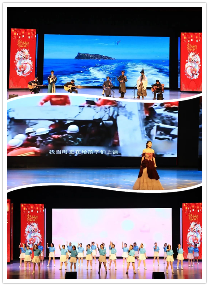 第二章笃行“砥砺筑梦”中,教师合唱《光阴的故事》,情景朗诵《致奋斗的青春》,舞蹈串烧,精彩纷呈。