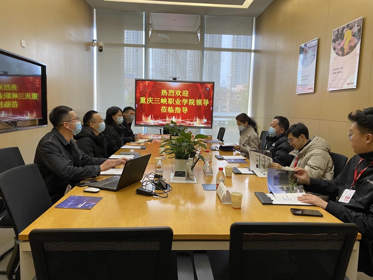在海康威视总部,杭州海康威视数字技术股份有限公司人力资源总监胡伟对陈章书记一行表示热烈欢迎,并介绍了海康威视的发展历程、业务板块、实习生发展项目、企业特色与成就,就近几年与重庆三峡职业学院合作情况进行了介绍。胡伟总监对我院实习学生的工作态度和专业能力表示认可,对重庆三峡职业学院智能制造学院与海康威视组建的2022级电子信息工程技术专业现代学徒制订单班提出高度评价,称赞我院学生培养规格与职业岗位匹配很高,并希望进一步加强校企之间的合作,培养与输送更多的人才进入海康威视。