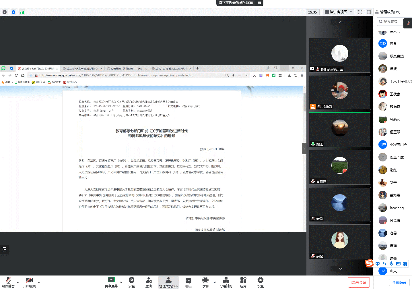 会上,副院长郎朗首先围绕教育部印发的《关于加强和改进新时代师德师风建设的意见》展开了学习。他以抗疫线上教学三位教师的优秀事迹为例,要求老师们加强学习,提质线上教学,促进五育并举。