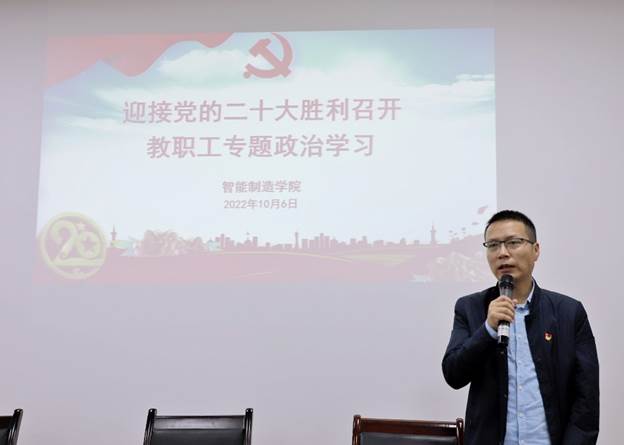 10月6日下午,智能制造学院党总支在奥训楼308会议室召开了10月“迎接党的二十大胜利召开”教职工主题政治学习会。智能制造学院党总支书记、院长熊江主持会议并讲话,副书记黄滔、副院长郎朗以及全体教职工和学生代表参加了学习会。