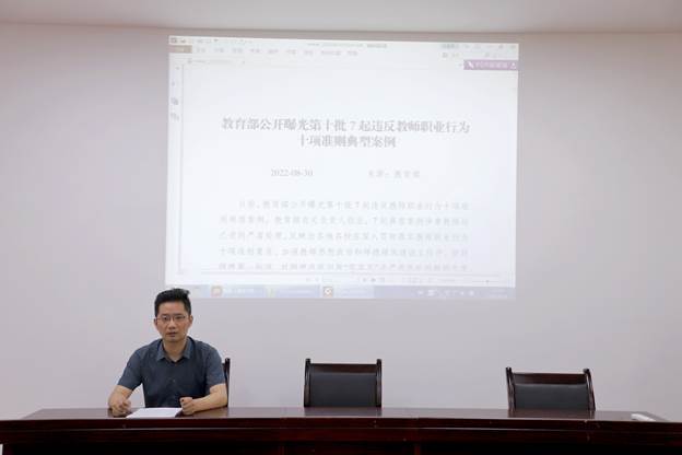 随后智能制造学院副院长郎朗通报了《教育部公开曝光第十批7起违反教师职业行为十项准则典型案例》,进行了师德师风专题学习教育。
