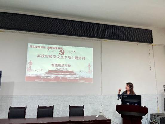 学院实训中心负责人姜妮为大家进行了高校实验室安全专项主题培训,她分别从安全基础知识、事故应急救援及处理等方面进行了详细讲解。