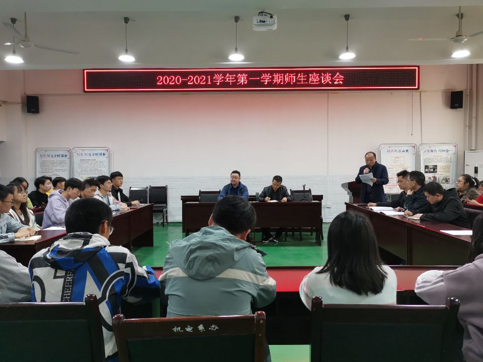 1110日下午,我院在奥训楼308召开了2020-2021学年第一学期师生座谈会。本次座谈会是学院本学期中期教学检查工作任务,旨在了解学生在学习生活上遇到实质问题,落实学院学风建设各项任务。会议由教务科魏向京科长主持,学院党总支书记、院长熊江教授、副院长徐明灿以及全院33个班级学生代表和各教研室主任,教师代表、辅导员代表出席了座谈会。