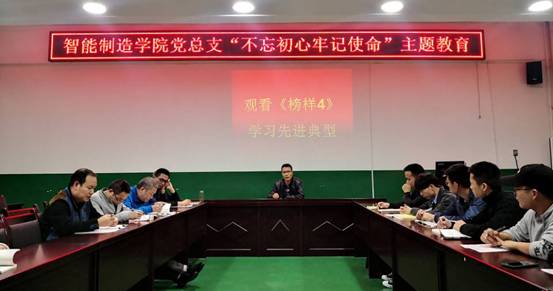 按照学校党委“不忘初心、牢记使命”主题学习教育实施方案的要求,10月22日下午,智能制造学院党总支在奥训楼308会议室开展了“不忘初心、牢记使命”主题教育之“学习先进典型”研讨会。此次集中学习的主要内容是观看《榜样4》学习先进典型暨组织学习《关于基层支部如何搞好主题教育》文献内容。智能制造学院党总支全体党员师生共同参加了学习,本次活动由智能制造学院党总支书记熊江主持。