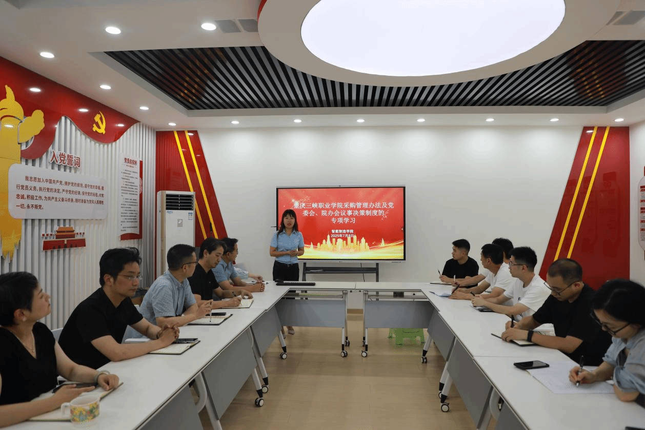 2025年7月8日下午,智能制造学院在奥训楼304召开专题会议,组织学习重庆三峡职业学院采购管理办法及党委会、院办会议事决策制度,并传达预算工作会精神。学院领导班子、全体专业教研室主任、处科级干部、实训中心及工厂负责人、学工科与教学科干事等18人参会。会上,智能制造学院实训中心主任姜妮领学《重庆三峡职业学院关于印发采购实施办法的通知》《中共重庆三峡职业学院委员会关于印发〈党委会会议议事规则〉〈校长办公会议事规则〉...