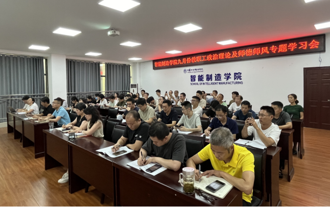 9月27日下午,智能制造学院在奥训楼308会议室开展了9月政治理论学习,会议由党总支副书记黄滔主持,全体教职工参加了学习。 会上,第三党支部书记赵伟领学了习近平关于培养德智体美劳全面发展的社会主义建设者和接班人的指示精神、中国共产党第二十届中央委员会第三次全体会议公报、中共中央国务院关于弘扬教育家精神加强新时代高素质专业化教师队伍建设的意见、中共中央关于进一步全面深化改革 推进中国式现代化的决定、中共中...