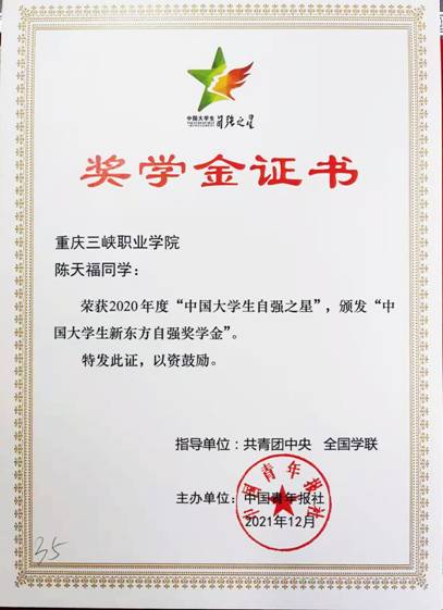 智能制造学院2019级数控技术班陈天福同学荣获团中央2020年度“中国大学生自强之星”荣誉称号,并获得“中国大学生新东方自强奖学金”