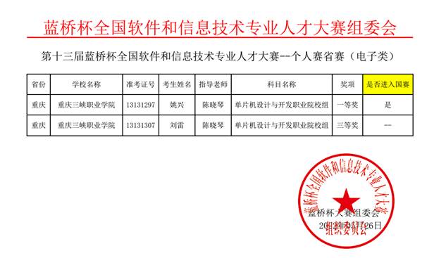 近日,由工信部主办的“第十三届蓝桥杯全国软件和信息技术专业人才大赛”省赛已顺利结束,来自重庆市20多所高校的500余名选手参赛。我院陈晓琴老师指导学生在“单片机设计与开发”(大学组)项目中获得一等奖1项、三等奖1项;姜妮老师、陈晓琴老师指导学生在 “C/C++程序设计”(高职高专组)项目中获得二等奖2项。一等奖获奖选手姚兴系我院20级电子信息技术专业学生,他将代表重庆市参加“单片机设计与开发”(大学组)国赛...