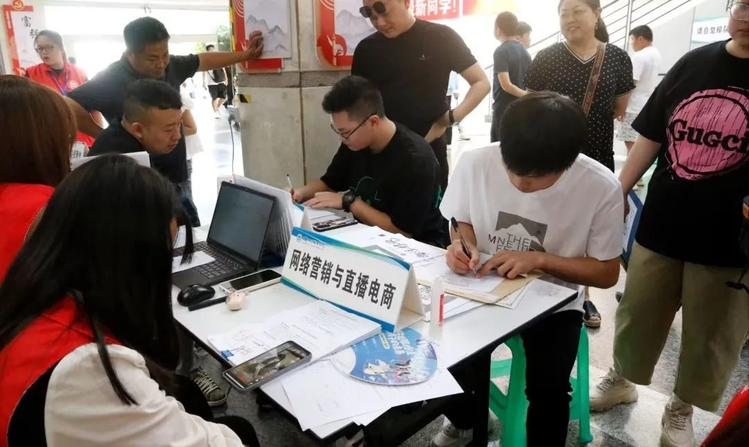 新生们在学长学姐的帮助下办理缴费等报到手续